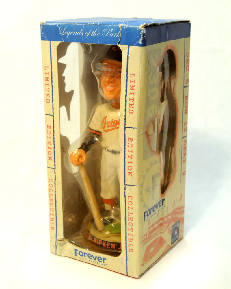 Baltimore Orioles Cal Ripken Jr Legends Bobblehead. This bobblehead honors Ripken in the limited edition Legends of the Park series. Stands about 9 inches tall. The highest quality bobble you can find. Each bobble is handcrafted, hand painted, & hand serial numbered on the base. Manufactured by the Premier Maker of bobbles – Forever Collectibles. Officially licensed by the MLB and a guaranteed authentic item to add to your collection!