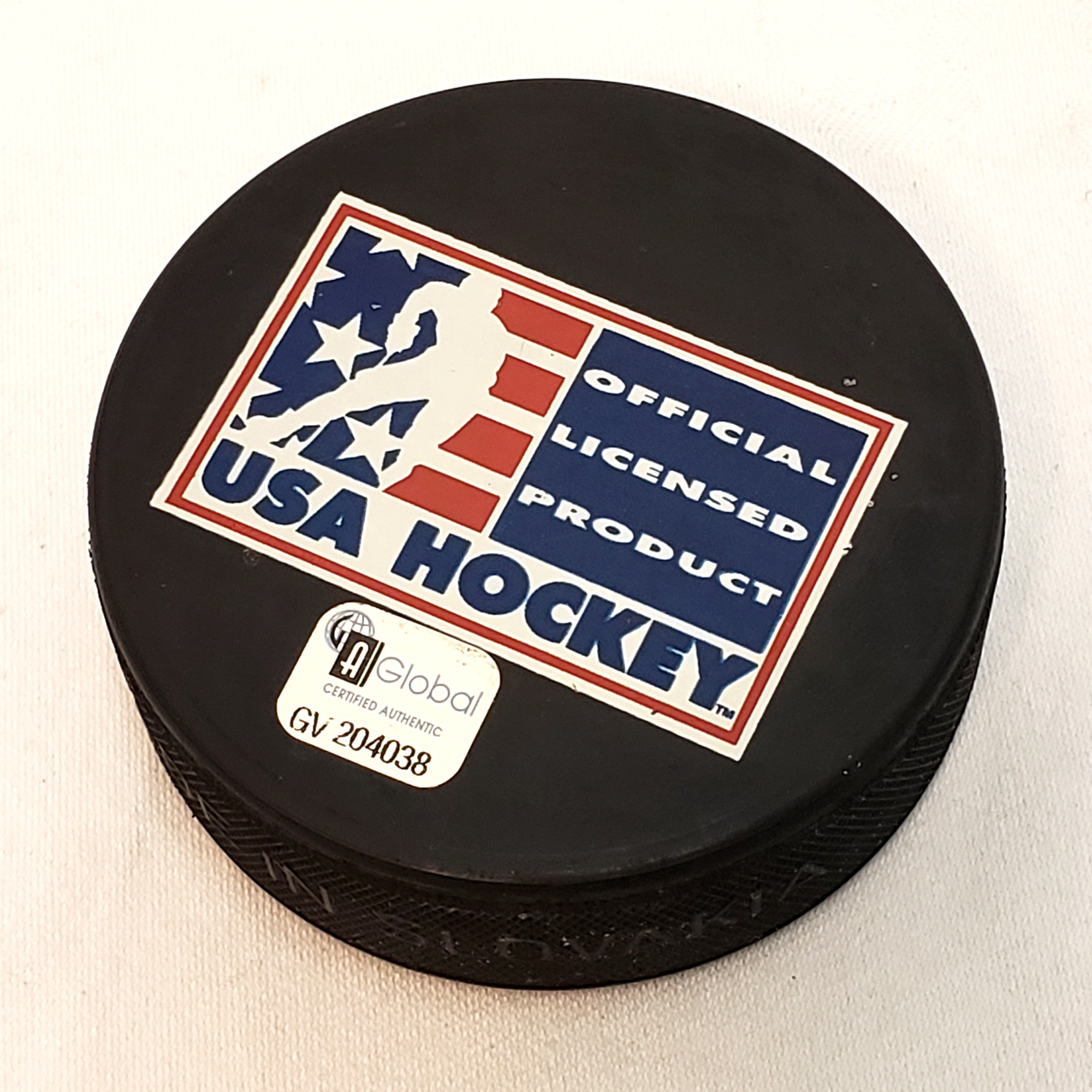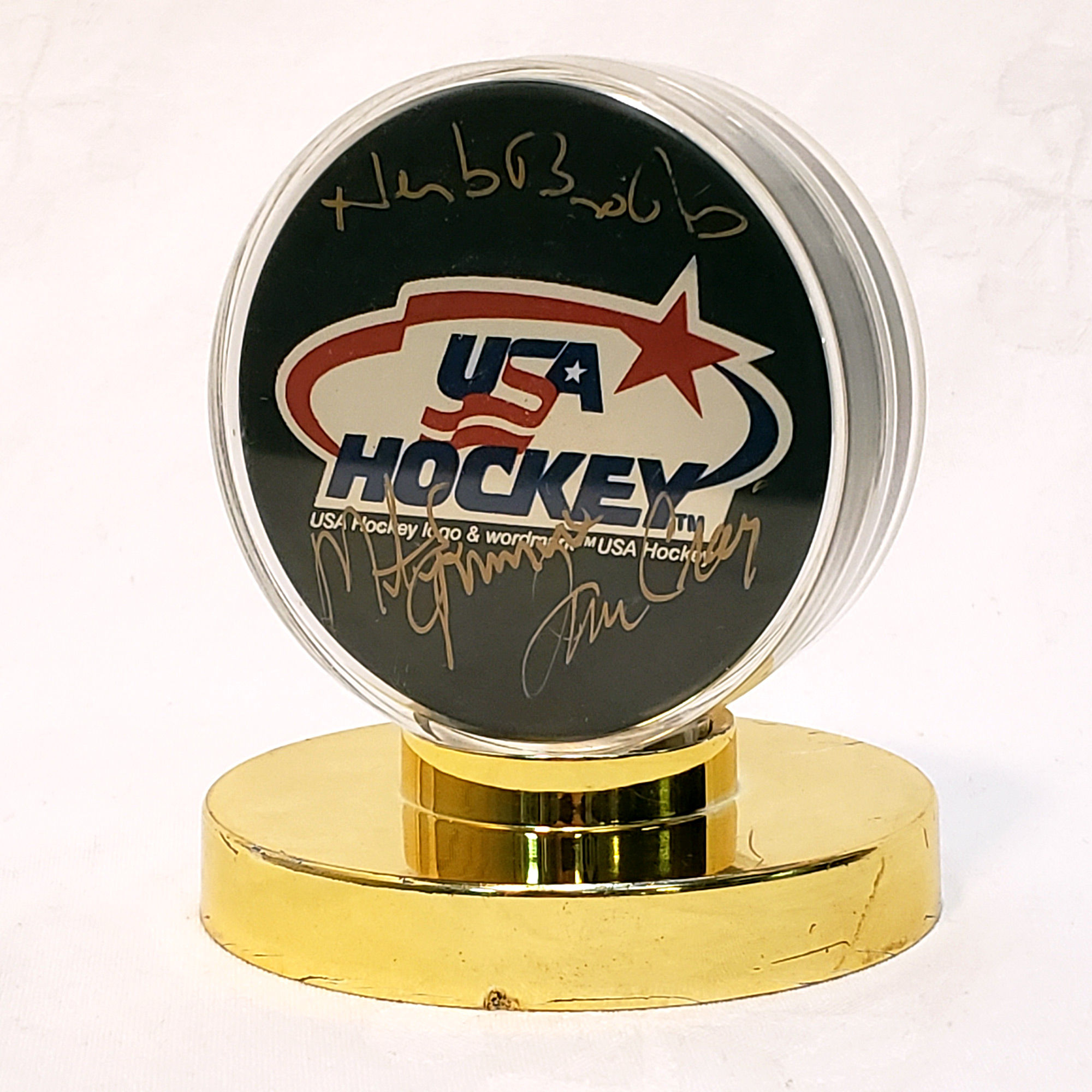 Herb Brooks Signed Hockey Puck from the 1980 US Hockey Team. Puck is also autographed by J. Craig and M. Eruzione. COA issued by Global Authentics.