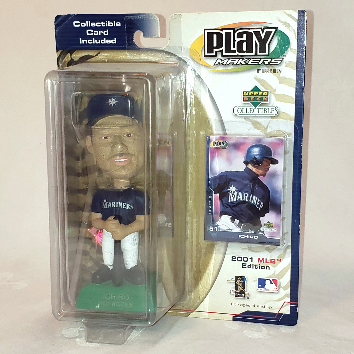 Seattle Mariners Ichiro Suzuki Upper Deck Play Makers BobbleHead. This 2001 Special Edition honors Ichiro’ rookie year. These Upper Deck bobbleheads are hand crafted, highly detailed collectibles. They are approximately 7 inches tall and made of a plastic polymer material.